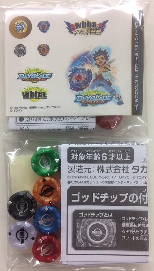 ベイブレードバースト wbba 大会特別景品ゴッドチップ6色+WBBA神ステッカー2枚セット⇒ステッカーが無い商品が届いた場合は出品者に再送を依頼!反応がない場合はカスタマーサービス(0120-999-373)に通報!タカラトミー (C) TOMY/Shogakukan (C) TOMY画像1は商品全部、画像2はゴッドチップ6種(背景は商品に含まれません)、画像3が本商品の表と裏の写真、ゴッドチップは合計6個です。【免責事項】メーカーによる商品リニューアルに伴いパッケージ(内容量も含む)変更が行われた場合、新パッケージでお届け致します事ご了承願います。