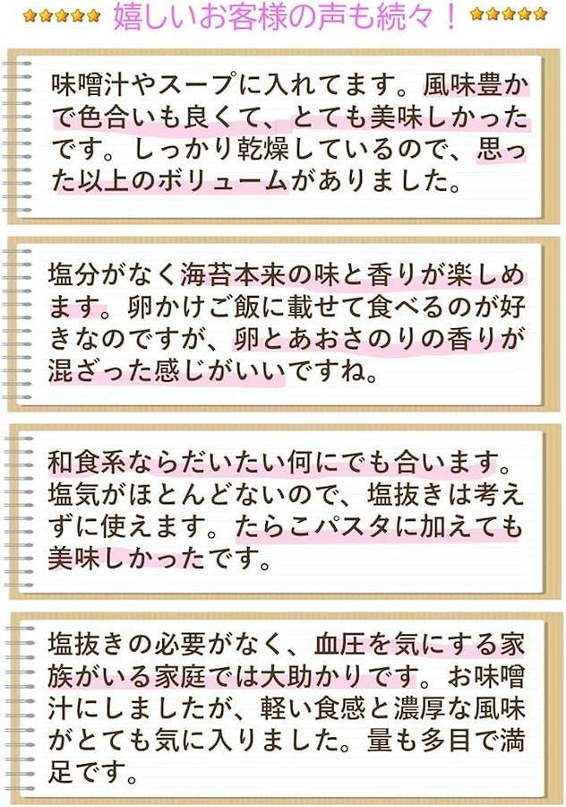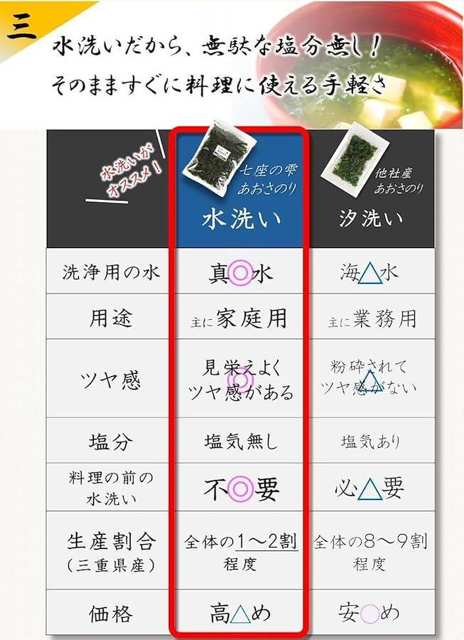 一般的なあおさのりは、「汐洗い(しおあらい)」といい、採れたばかりのあおさのりを海水で洗うため、塩分が多く残り、ツヤ感も失われます。