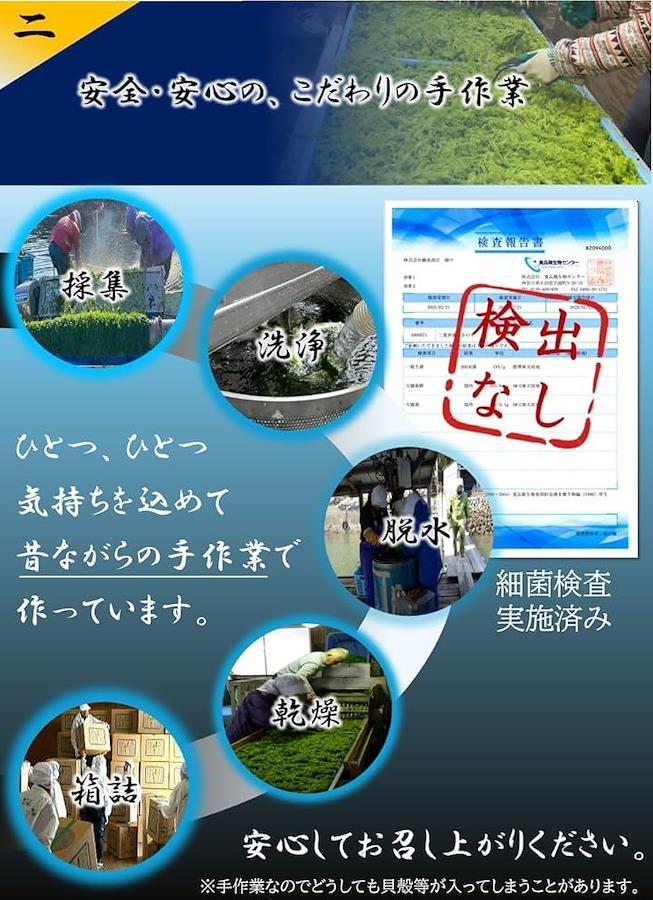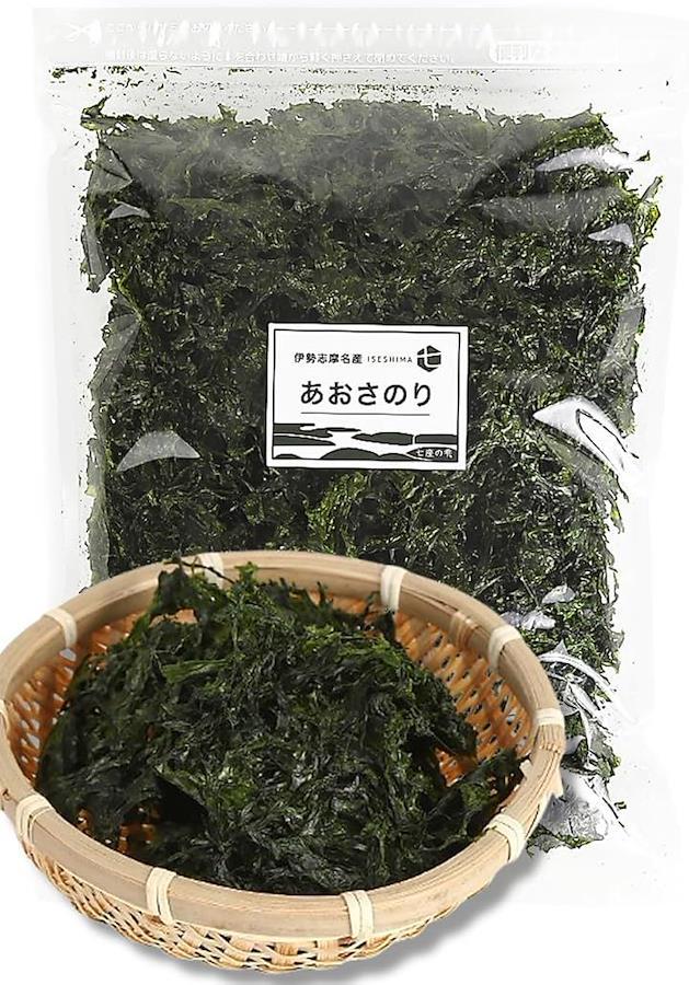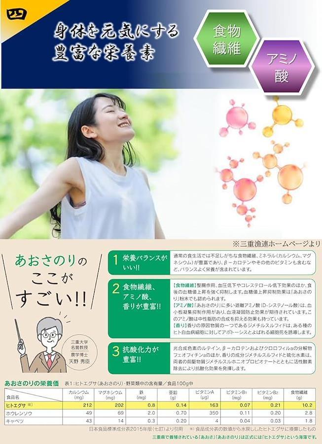 三重県産のあおさのり(正式名称ヒトエグサ)には、多くの食物繊維、アミノ酸などが含まれ、また抗酸化力も豊富です。食物繊維やカルシウムはほうれん草の約5倍、マグネシウムは3倍含まれています。