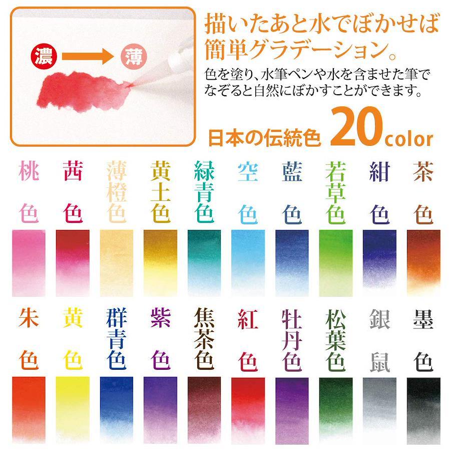 ・水彩毛筆【彩】20色(紅色、朱色、黄色、若草色、緑青色、藍色、群青色、紫色、黄土色、茶色、銀鼠、墨色、桃色、薄橙色、空色、茜色、牡丹色、焦茶色、松葉色、紺色)
