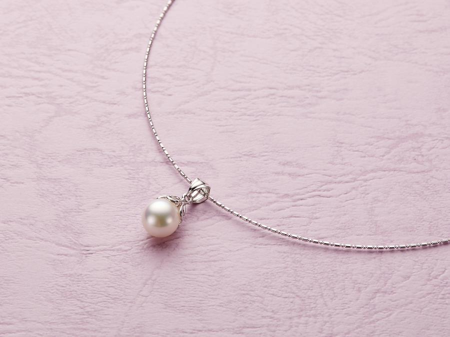 キラキラ輝く大粒あこや真珠ペンダント。形状記憶タイプのチェーンで形が崩れず綺麗なフォルムを保ちます。ピンフリー機能。