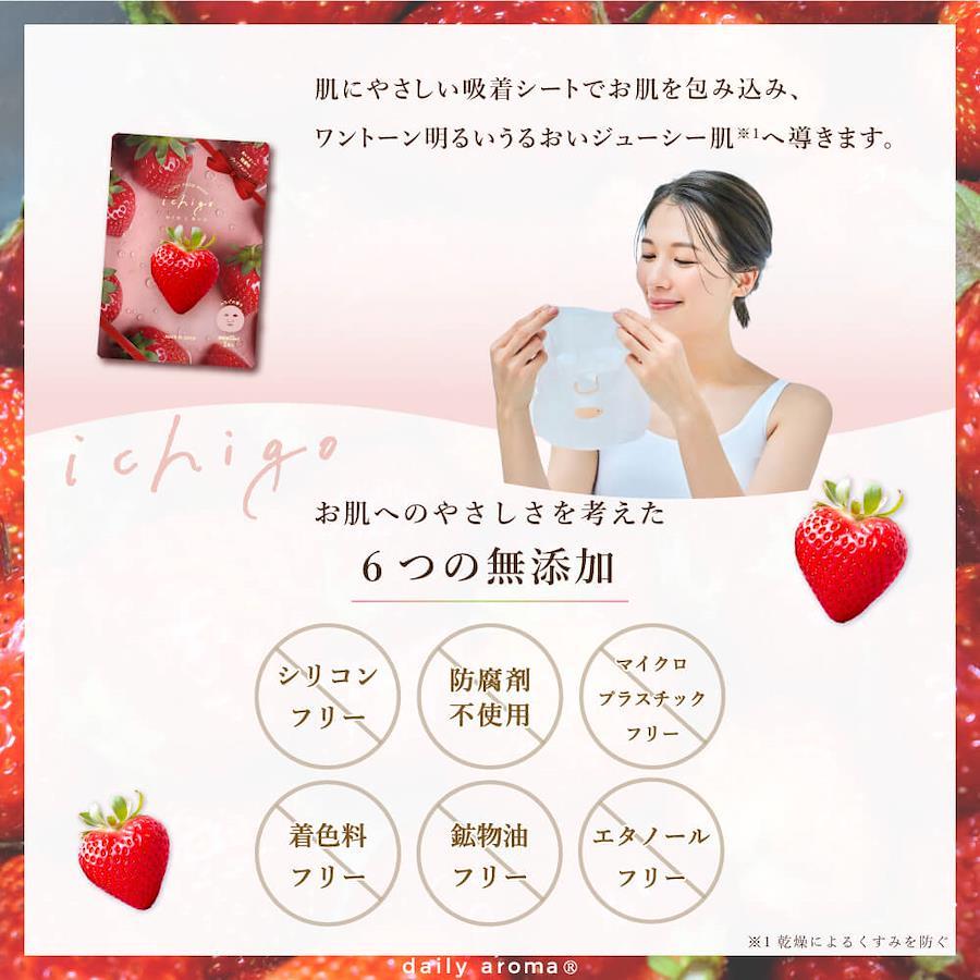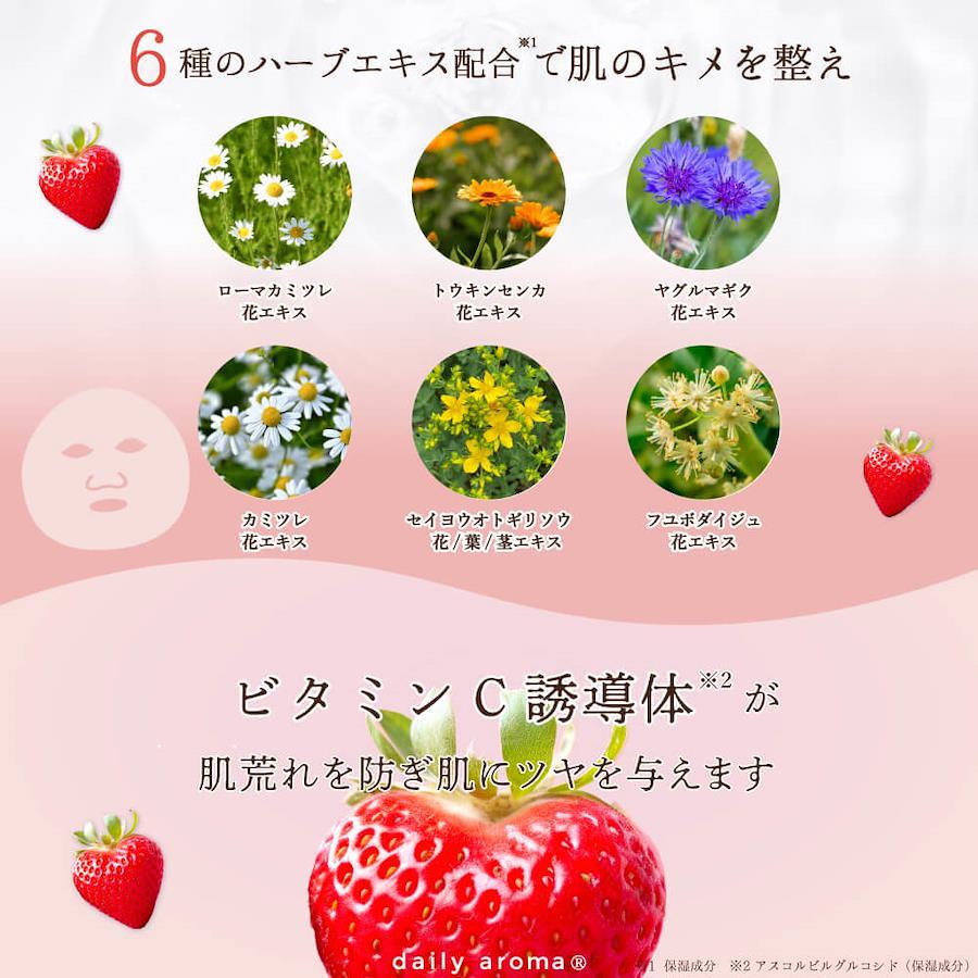 保湿成分としてイチゴ果実エキスをはじめとし、ビタミンC誘導体※3、ヒアルロン酸Na、加水分解コラーゲン、加水分解エラスチンを配合。肌にやさしい吸着シートでお肌を包み込んで、ワントーン明るいうるおいジューシー肌※1に導きます。