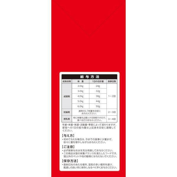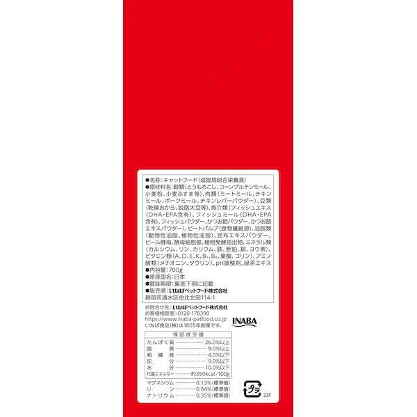 ●原材料:穀類(とうもろこし、コーングルテンミール、小麦粉、小麦ふすま等)、肉類(ミートミール、チキンミール、ポークミール、チキンレバーパウダー)、豆類(乾燥おから、脱脂大豆等)、魚介類(フィッシュエキス(DHA、EPA含有)、フィッシュミール(DHA、EPA含有)、フィッシュパウダー、かつお節パウダー、かつお節エキスパウダー)、ビートパルプ(食物繊維源)、油脂類(動物性油脂、植物性油脂)、昆布エキスパウダー、ビール酵母、酵母細胞壁、植物発酵抽出物、ミネラル類(カルシウム、リン、カリウム、鉄、亜鉛、銅、ヨウ素)、ビタミン類(A、D、E、K、B1、B2、葉酸、コリン)、アミノ酸類(メチオニン、タウリン)、pH調整剤、緑茶エキス