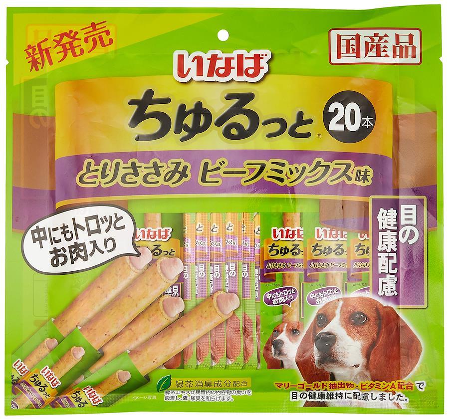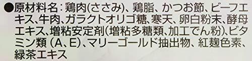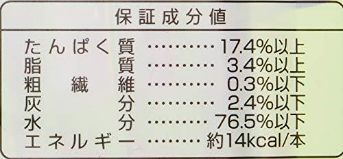 たんぱく質…17.4%以上、脂質…3.4%以上、粗繊維…0.3%以下、灰分…2.4%以下、水分…76.5%以下、エネルギー…約14kcal/本