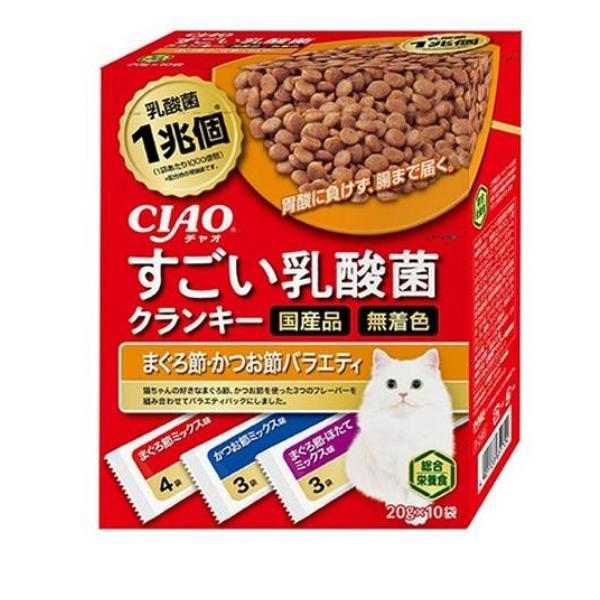 製品の特徴●いなばペットフード すごい乳酸菌クランキー まぐろ節・かつお節バラエティ P-248●乳酸菌1兆個(1袋あたり1,000億個)配合で、愛猫の健康を維持し、お腹の調子を保ちます。●20gの個袋が10袋入っています。●ねこちゃんの好きな「まぐろ節・かつお節」を使った3つのフレーバーを組み合わせてバラエティパックにしました。●緑茶消臭成分配合。緑茶エキスが腸管内の内容物の臭いを吸着し、糞・尿臭を和らげます。●この商品は、ペットフード公正取引協議会の定める分析試験の結果、総合栄養食の基準を満たすことが証明されています。●名称:キャットフード(成用総合栄養食)●形状:ドライフード●原産国名:日本(国産品)●セット内容:まぐろ節ミックス×4袋、かつお節ミックス×3袋、まぐろ節ほたてミックス味×3袋