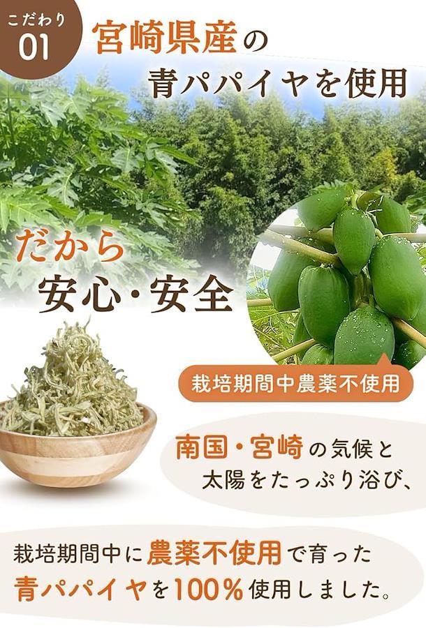 「宮崎県産青パパイヤを使用」南国・宮崎の温暖な気候と陽ざしをたっぷり浴びて育った青パパイヤを100%使用しました。