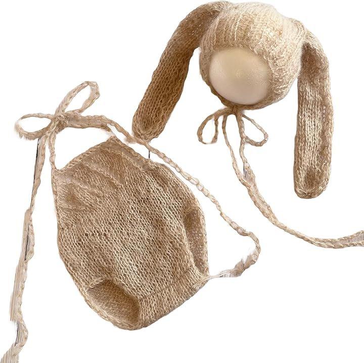 セット内容: 愛らしいうさぎ耳付きの帽子とホルターネック式オーバーオールの2点セット、新生児フォト撮影に最適