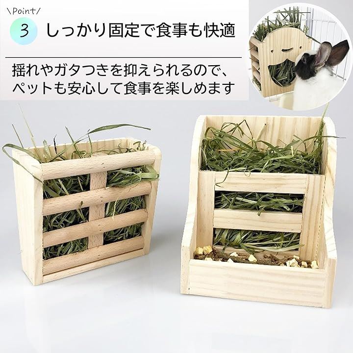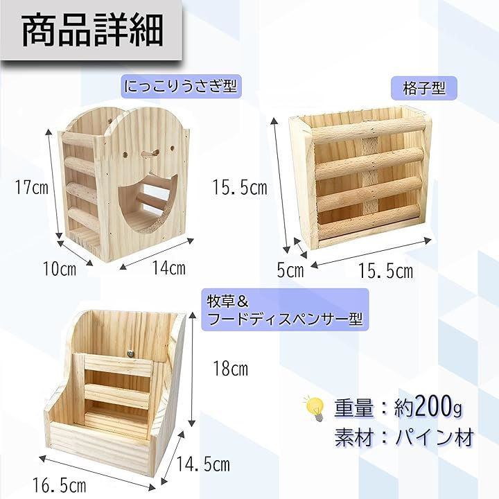 「商品詳細」にっこりうさぎ型:14cmx10cmx17cm、格子型:15.5cmx15.5cmx5cm、牧草&フードディスペンサー型:16.5cmx14.5cmx18cm 重量:約200g 素材:パイン材 *商品写真はできる限り実物の色に近づけるよう徹底しておりますが、 お使いのモニター設定、お部屋の照明等により実際の商品と色味が異なる場合がございます。