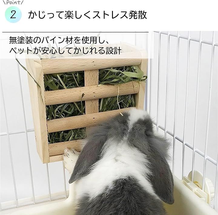 ケージにしっかり固定できるので、牧草が床に落ちにくく、いつでも清潔な状態をキープ。