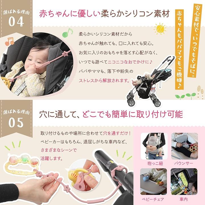 おしゃぶり立てとして、衛生的に使用可能です.. ベビーカーやチャイルドシートはもちろん、抱っこ紐や車内にも取り付けOK。