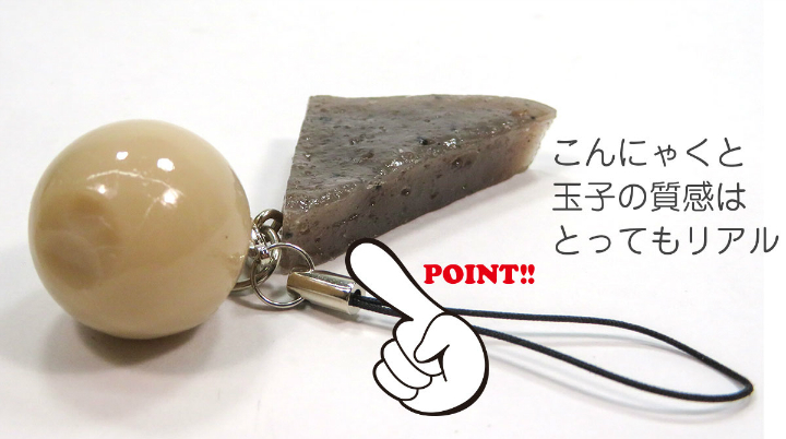 おでんA(玉子、こんにゃく)サイズ : 3cm×4cm×2cm重さ : 14g(キーホルダー:+5g、ストラップ:+1g)