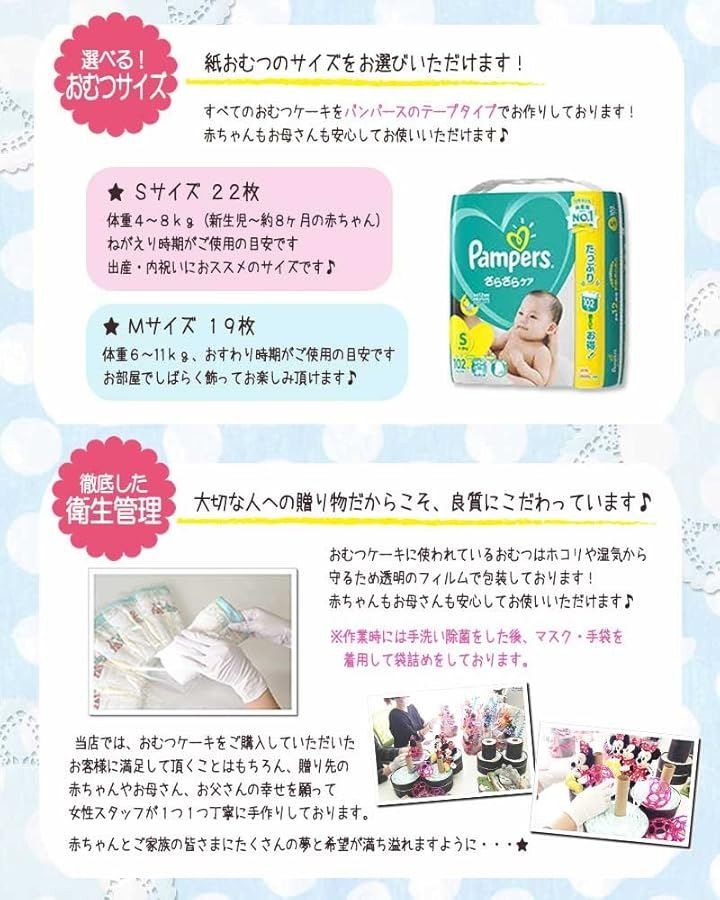 「おむつのサイズ選び」オムツケーキの紙おむつは人気のパンパーステープタイプを使用。