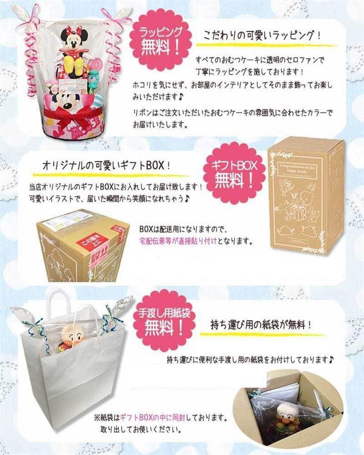 さらに、全てのおむつケーキは女の子用にプレゼント用のギフトラッピングで丁寧に仕上げられ、可愛らしいデザインボックスに入れてお届けいたします。