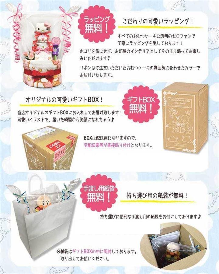 さらに、全てのおむつケーキは女の子用にプレゼント用のギフトラッピングで丁寧に仕上げられ、可愛らしいデザインボックスに入れてお届けいたします。