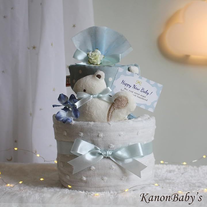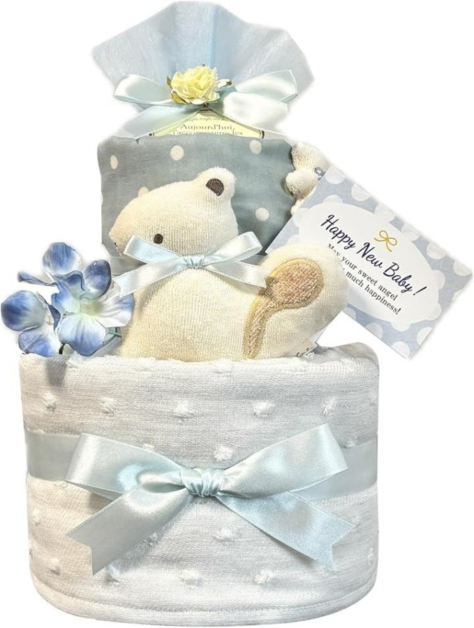 男の子の出産祝いに人気のギフト: オーガニックのタオルとスタイを使ったおむつケーキは、その高品質で人気を集めており、赤ちゃんも喜ぶ贈り物として選ばれています。