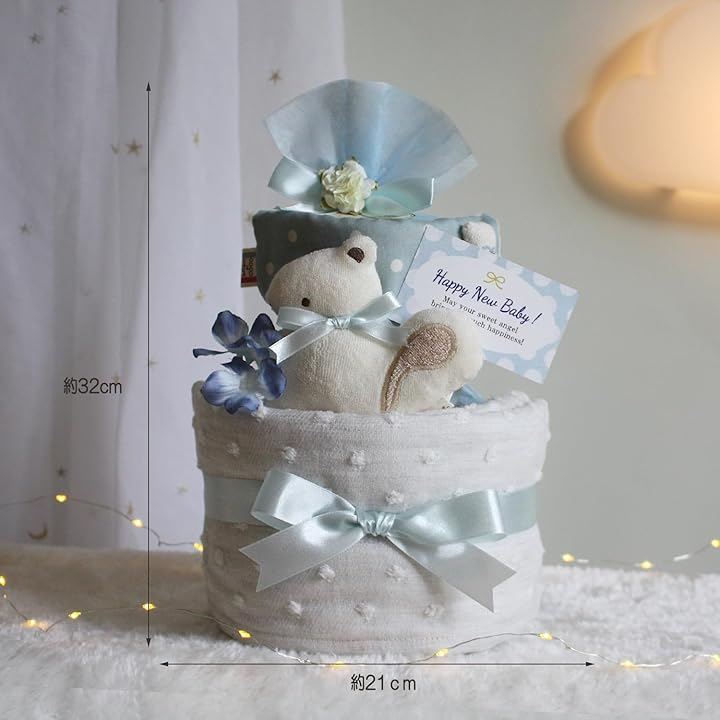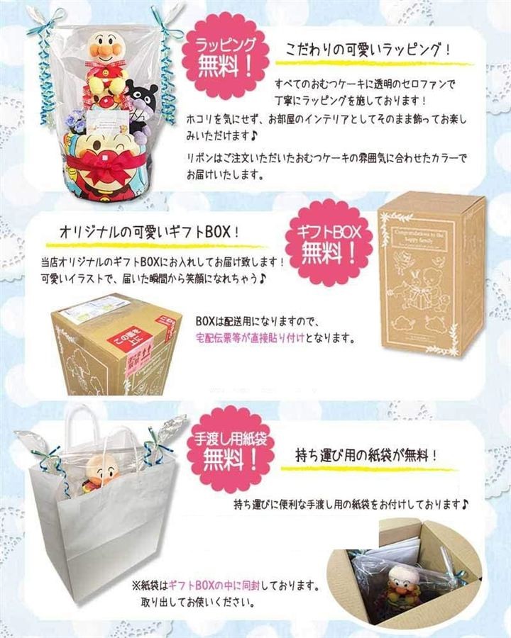 さらに、全てのおむつケーキは男の子に合うギフトラッピングで丁寧に仕上げられ、可愛らしいデザインボックスに入れてお届けします。