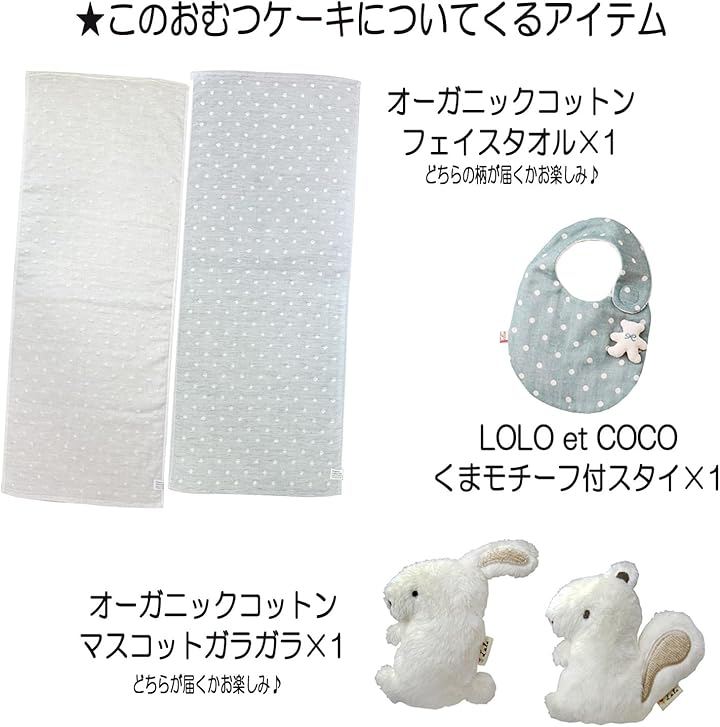 このおむつケーキには、赤ちゃんの敏感な肌にやさしいオーガニックコットンのスタイと、赤ちゃんが安心して遊べるオーガニック素材のガラガラが付いています。