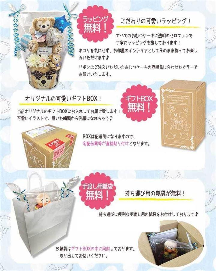 さらに、全てのおむつケーキは男の子用にプレゼント用のギフトラッピングで丁寧に仕上げられ、可愛らしいデザインボックスに入れてお届けいたします。