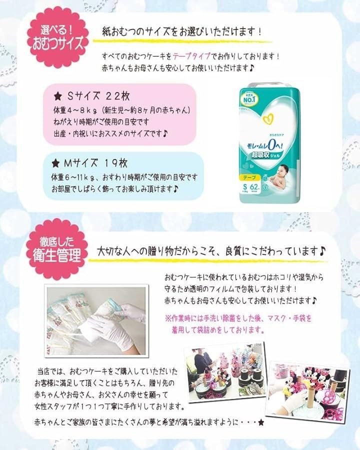Sサイズは出産祝いやベビーシャワー、Mサイズは1歳の誕生日プレゼント、ハーフバースデー、100日祝い、初節句などに最適です