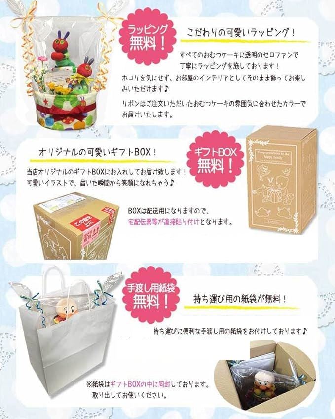 さらに、全てのおむつケーキは男の子や女の子のどちらでも使えるプレゼント用のギフトラッピングで丁寧に仕上げられ、可愛らしいデザインボックスに入れてお届けいたします。