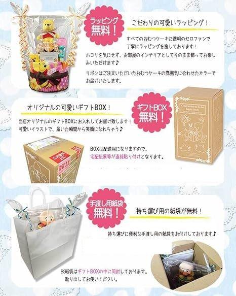 さらに、全てのおむつケーキは男の子にも女の子にも合うプレゼント用のギフトラッピングで丁寧に仕上げられ、可愛らしいデザインボックスに入れてお届けいたします。
