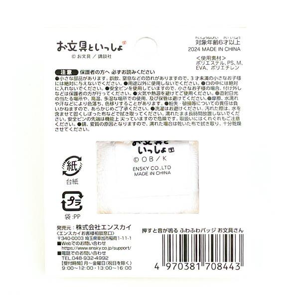 「お文具といっしょ」よりふわふわバッジが登場です。こちらはかわいいお文具さん。押すとピューピュー音が鳴る仕様です♪