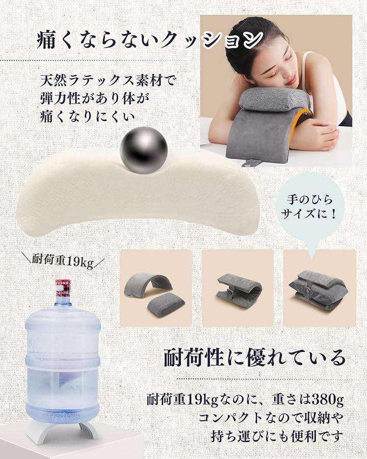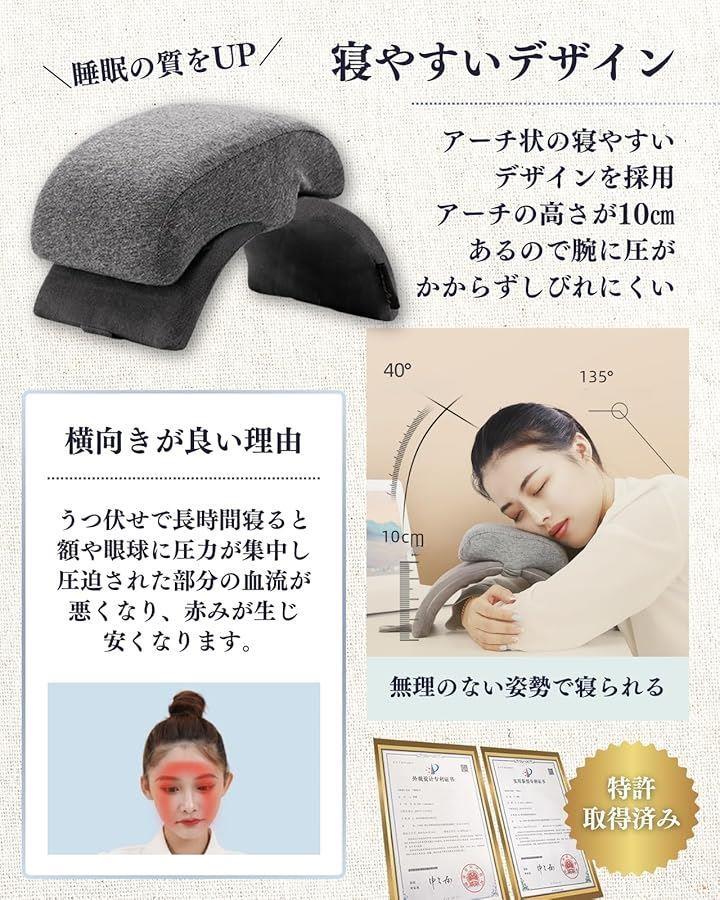 「腕が痺れないデザイン」アーチ構造により、腕を通すことができ、手がしびれず頭の位置も安定します。
