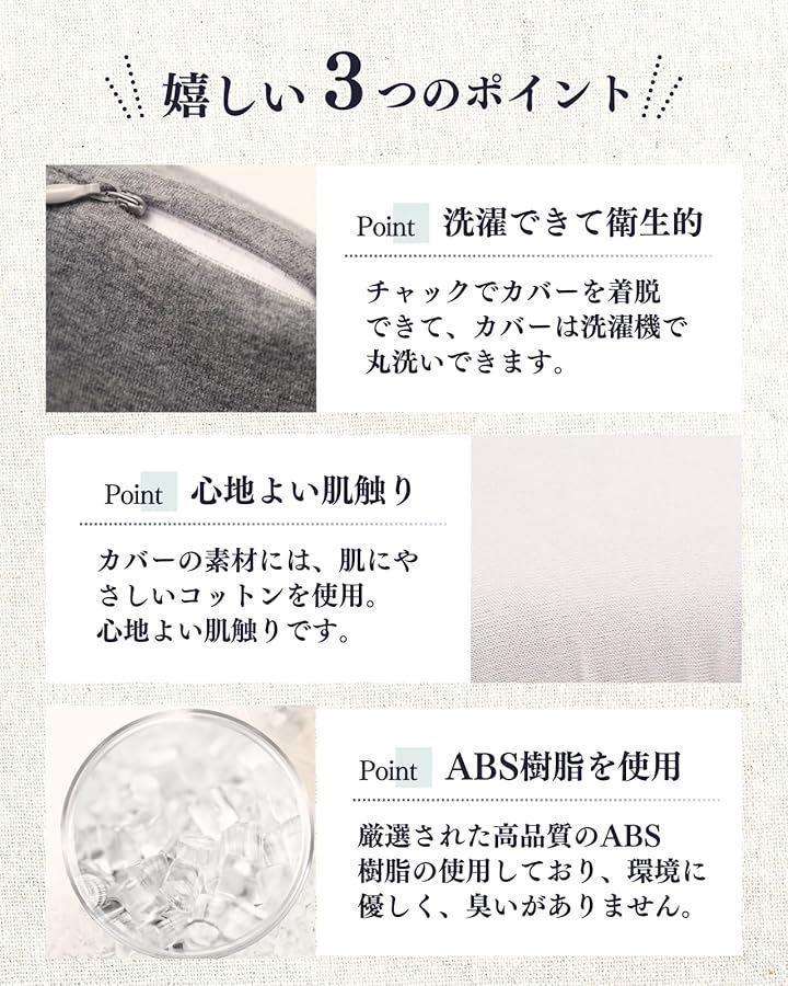 「肌に優しい素材」枕の表面はコットン生地を使用しており、肌に優しく快適です。