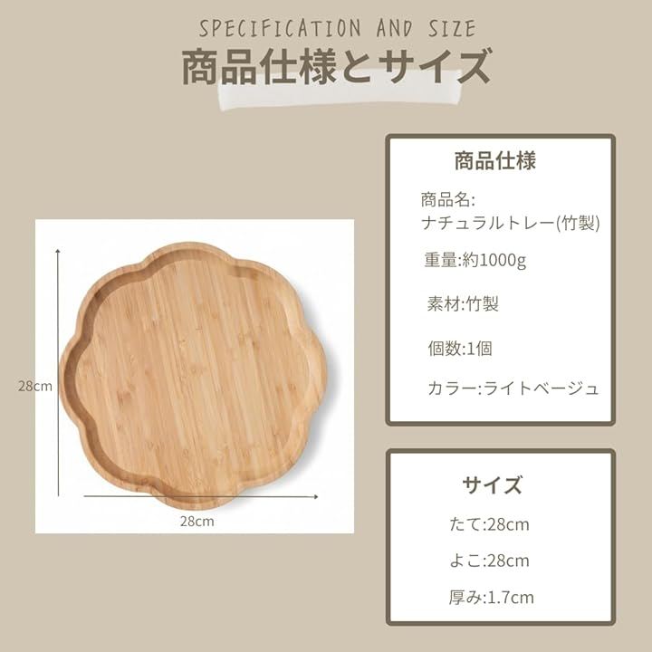 「商品仕様」商品名:花形お盆 サイズ:28cmx28cm 厚み:1.7cm 素材:竹 個数:1個