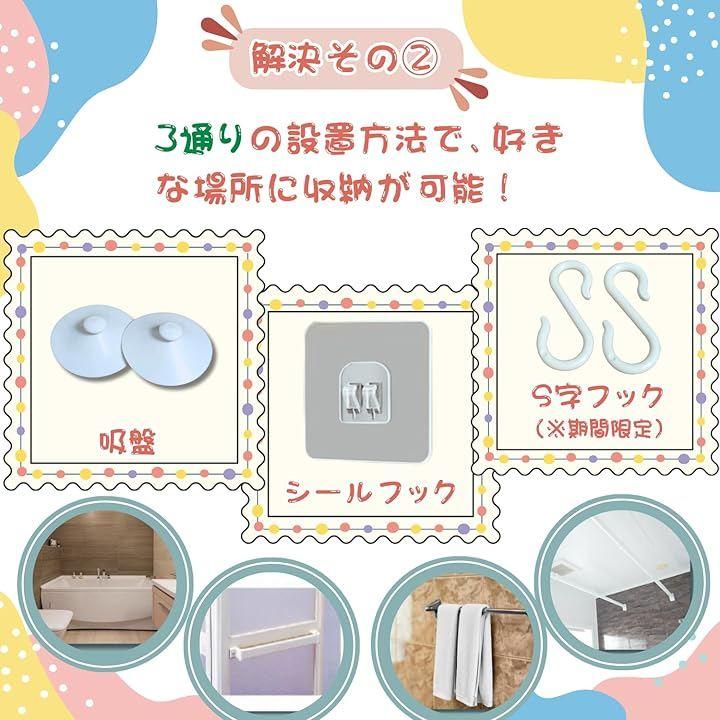 「取り付け簡単」吸盤でタイルや壁面に簡単に設置でき、付属品のシールフックとS字フックで設置場所も選べます。
