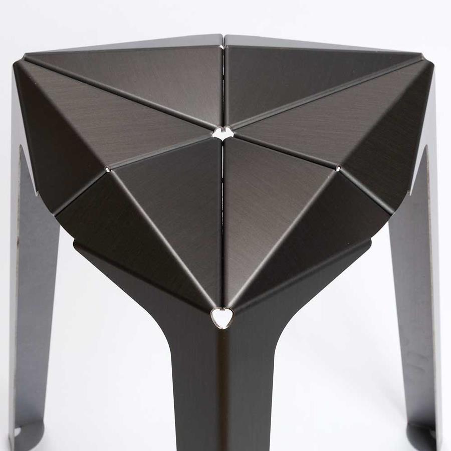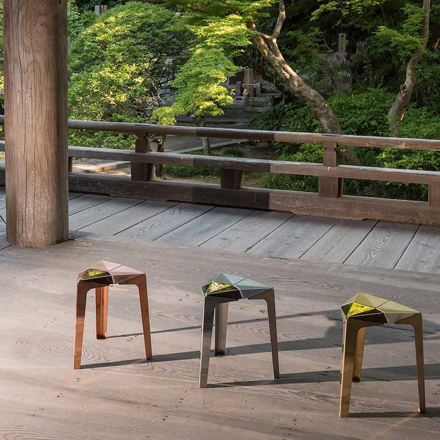 置いておくだけで空間が華やかになるジュエリーのように光り輝くスツール。同じ形のパーツから出来ていて、折り紙のように金属を折って作りました。