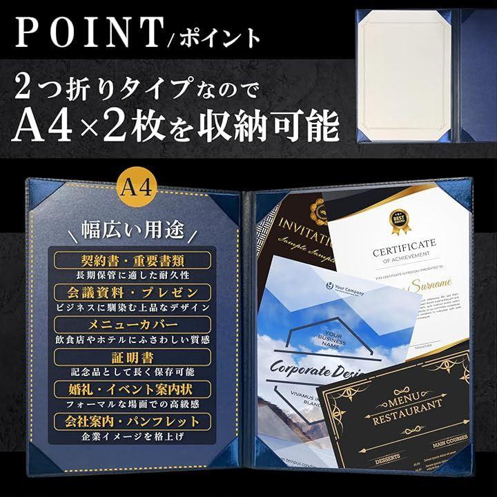 ・ A4x2枚収納可能な2つ折り設計 契約書、プレゼン資料、証書、案内状などを2枚までしっかりと収納できます。