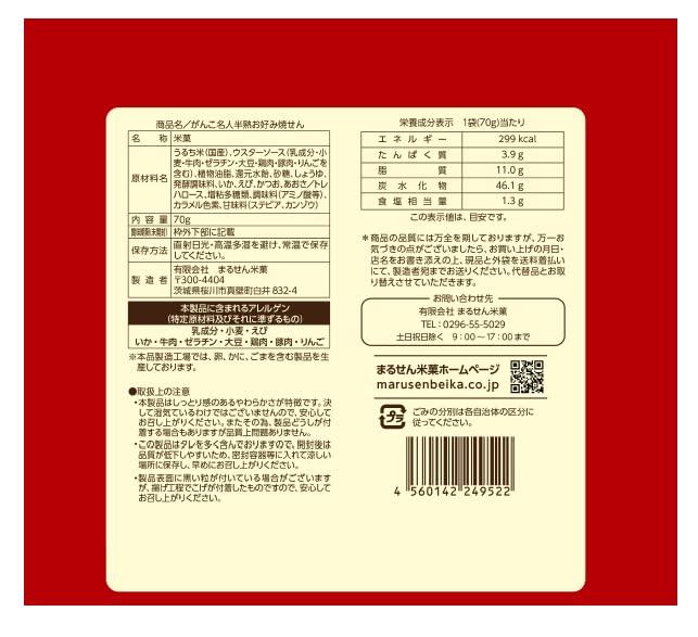 うるち米(国産)、ウスターソース(乳成分・小麦・牛肉・ゼラチン・大豆・鶏肉・豚肉・りんごを含む)、植物油脂、還元水飴、砂糖、しょうゆ、発酵調味料、いか、えび、かつお、あおさ/トレハロース、増粘多糖類、調味料(アミノ酸等)、カラメル色素、甘味料(ステビア、カンゾウ)