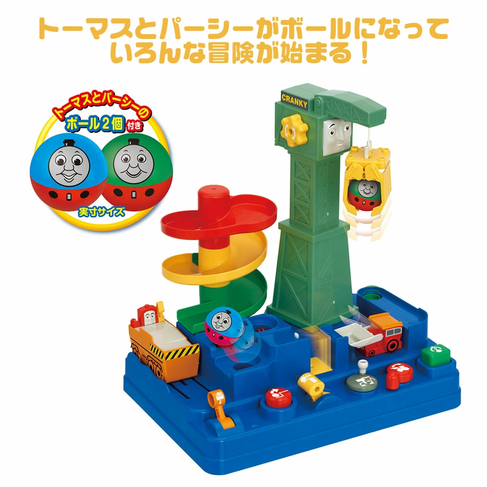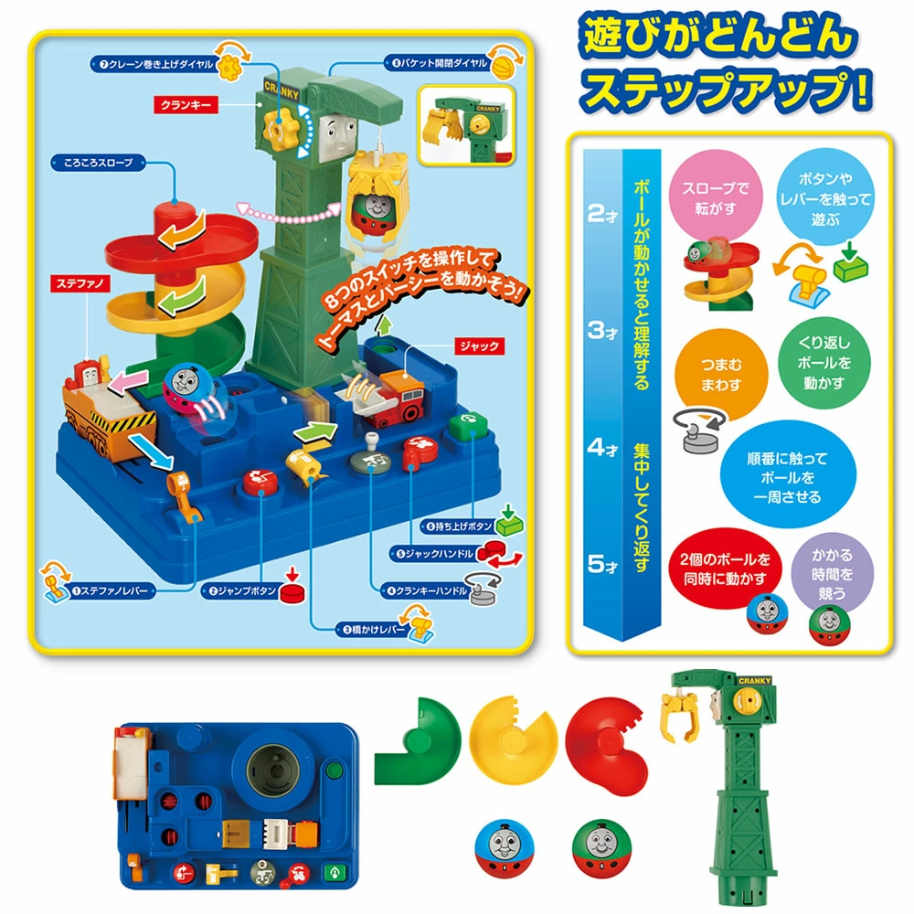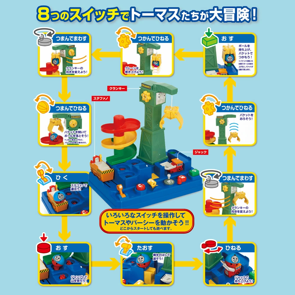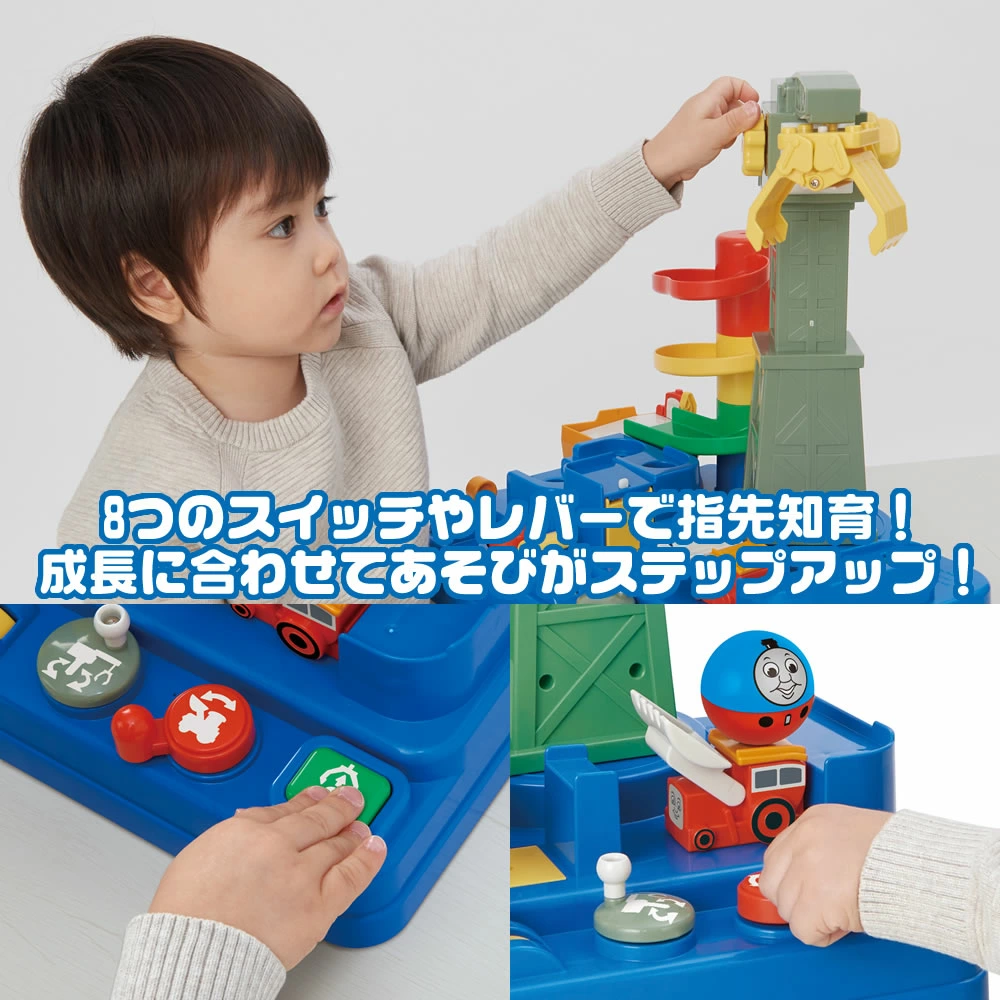 電池がいらない!8つのスイッチやレバーで指先知育!成長に合わせてあそびがステップアップ!トーマスとパーシーがボールになっていろんな冒険が始まる!スイッチやレバーを指先で操作してボール状のトーマスたちがコースを上手に転がるように操作しよう!8種類のいろいろな動きをするスイッチやレバーを操作することで指先の巧緻性(器用さ)や集中力、色の認識力が育まれます。お子様の発達の段階に合わせて長く遊べる知育玩具です。