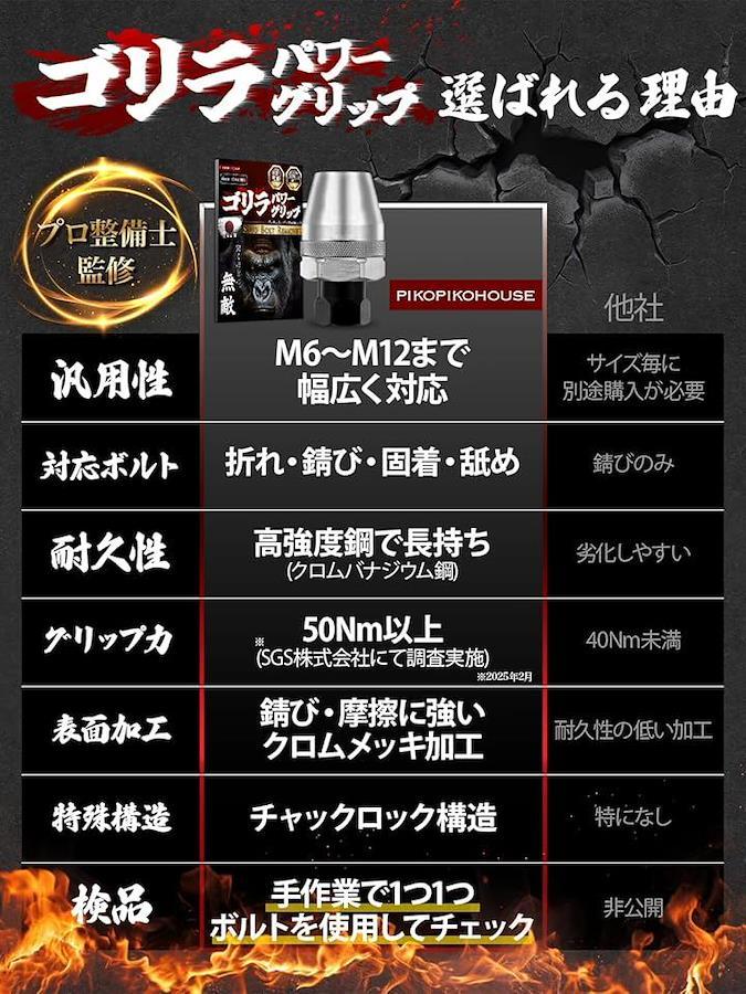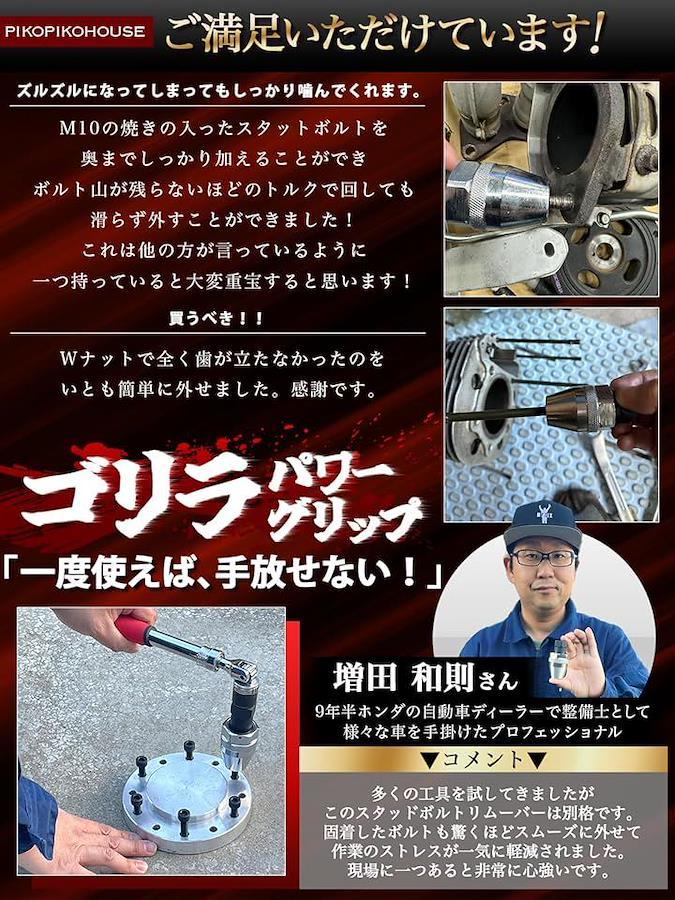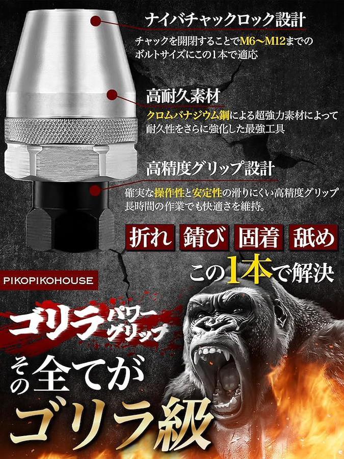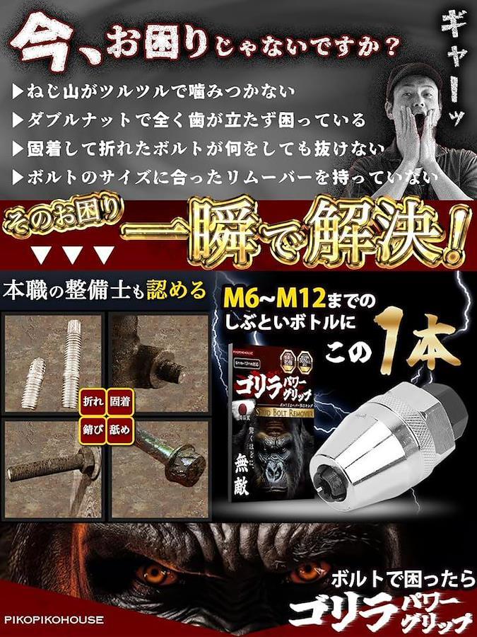 「ゴリラパワーグリップの詳細」破損したスタッドボルトの取り外しに最適なエクストラクターツールです。
