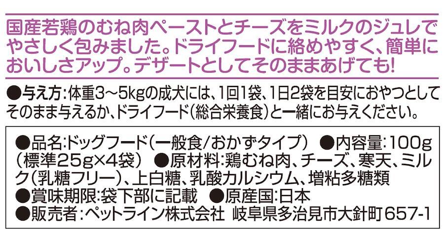 鶏むね肉、チーズ、寒天、ミルク(乳糖フリー)、上白糖、乳酸カルシウム、増粘多糖類