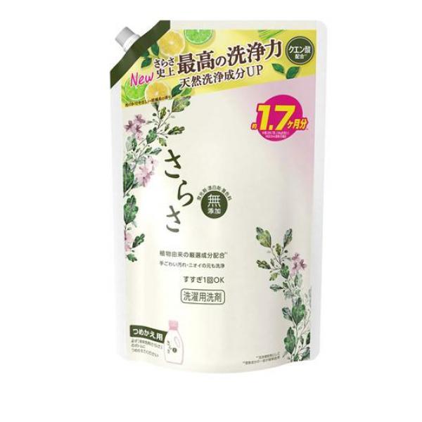 製品の特徴●さらさ史上最高の洗浄力 天然洗浄成分UP●クエン酸配合(*1)●蛍光剤・漂白剤・着色料 無添加●植物由来の厳選成分配合(*2)●手ごわい汚れ・ニオイの元も洗浄●天然酵素を配合した処方●家族みんなの衣類もOK●肌を優しく包み込む●すすぎ1回OK●ほのかでやさしい柑橘系の香り●無りん●日本製●品名:洗濯用合成洗剤●用途:綿、麻、合成繊維用●液性:弱アルカリ性