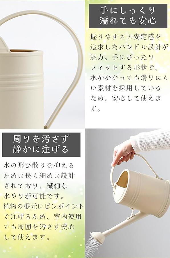 「水飛び散りを防ぐ長い注ぎ口」長めに設計された注ぎ口が、水やりの際の飛び散りを回避し、スムーズな水の流れを実現します。