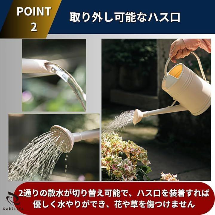 「取り外し可能なハス口」2通りの散水方法が切り替え可能で、ハス口を装着すれば優しく水やりができ、花や草を傷つけません。