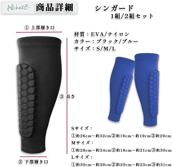 「商品内容」 シンガード1本/2本セット 材質:EVA/ナイロン カラー:ブラック/ブルー Sサイズ:長さ/約29cm 上部履き口/約26cm~約32cm 下部履き口/約16cm~約19cm Mサイズ:長さ/約30cm 上部履き口/約28cm~約34cm 下部履き口/約18cm~約21cm Lサイズ:長さ/約31cm 上部履き口/約30cm~約39cm 下部履き口/約20cm~約23cm