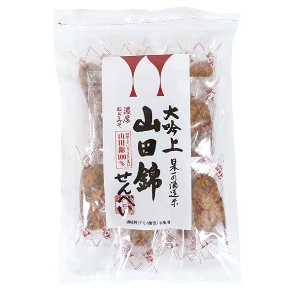大吟上山田錦せんべい袋入ねぎみそは日本一の酒造米である「山田錦」を100%使用し、自然で体にやさしいお煎餅に仕上げました。