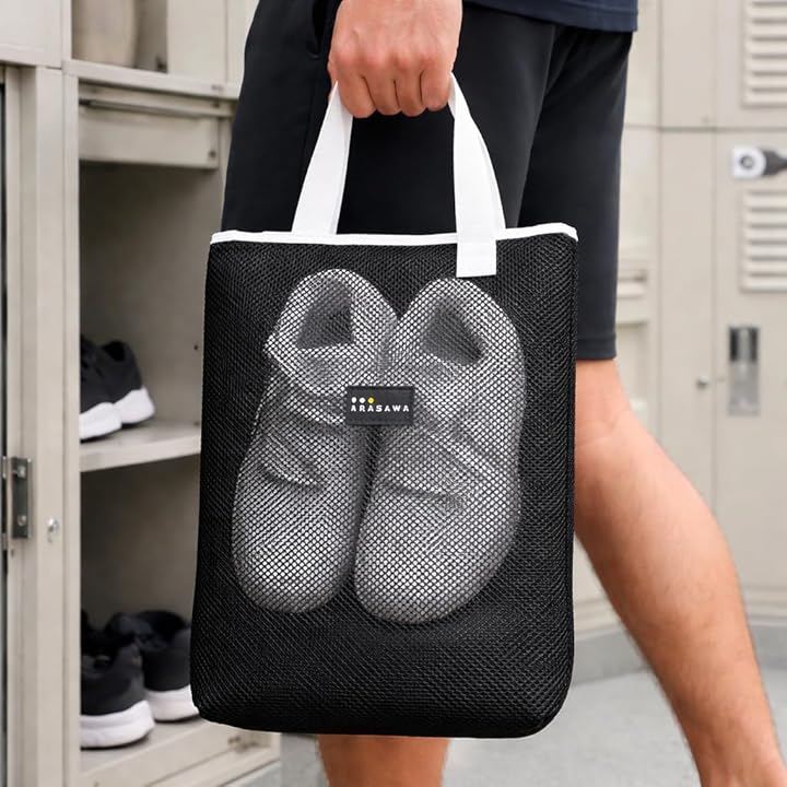 「おすすめ用途」 体育館シューズ・上履き入れ 旅行時の履き替え収納 「商品仕様」 素材:ポリエステルメッシュ カラー:ブラック 仕様:ハンドル付き/通気メッシュ構造 サイズ:H30xW24xD6.5(cm) 重量:75g
