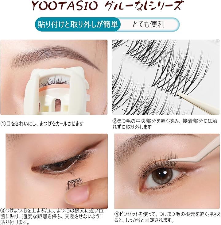 YOOTASIO すぐに使える グルーなしシリーズ 接着剤不要 落ちにくい --- 使用方法: (1) まつ毛の中央部分を軽く挟み、接着部分には触れずに取り外します。