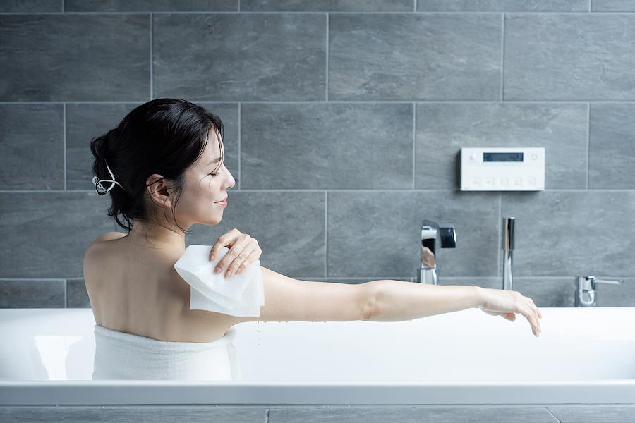 お湯に浸すと“生”のようにぷるんと戻り、肌の上をすべらせるだけで、摩擦を最小限に抑えながら汚れだけを落とします。
