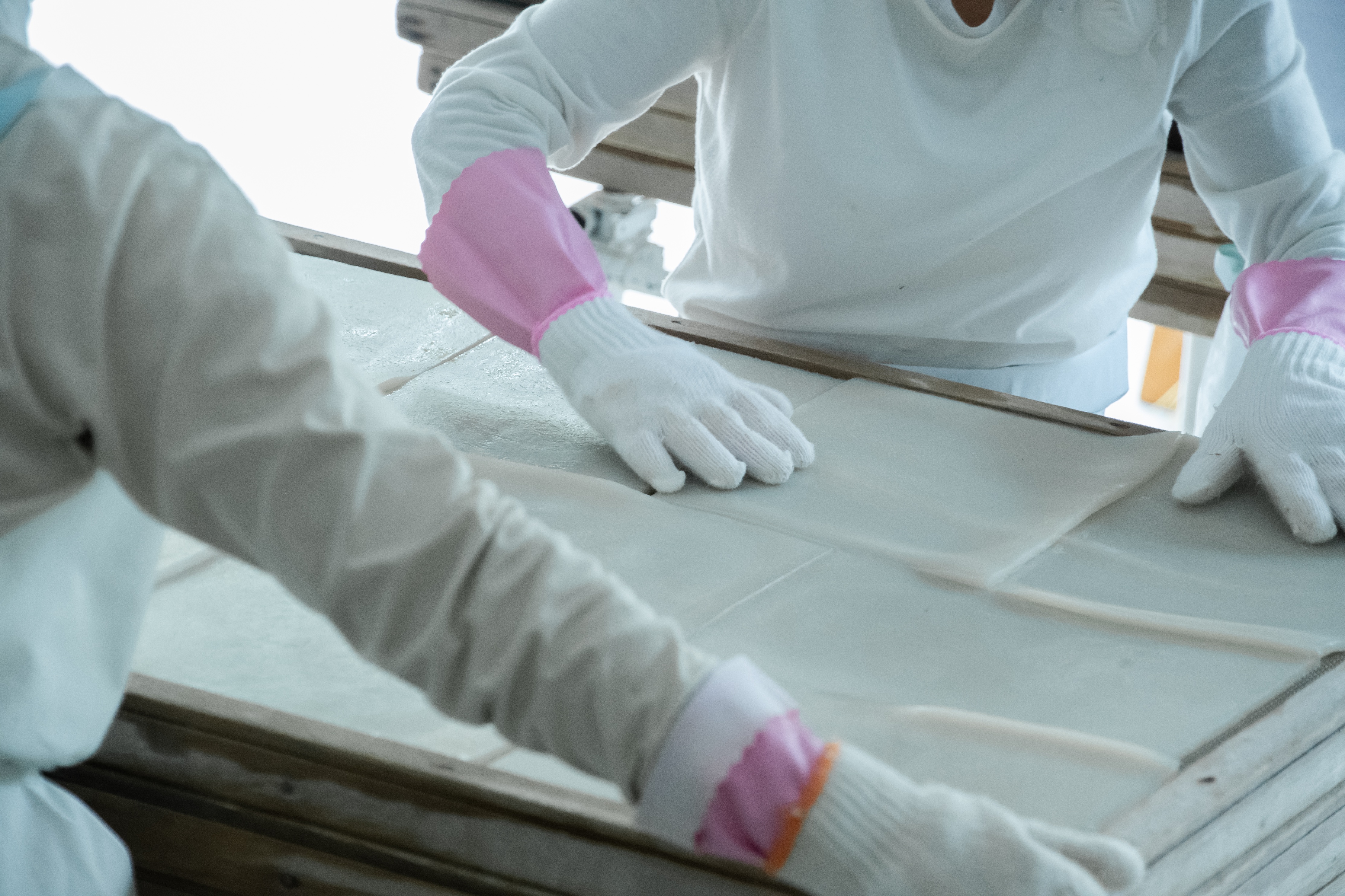 使用しているのは、300年以上受け継がれてきた日本の伝統技術「凍蒟蒻」。自然の寒さと時間だけで仕上げられた天然こんにゃく繊維が、他にはないやわらかな弾力を生み出します。
