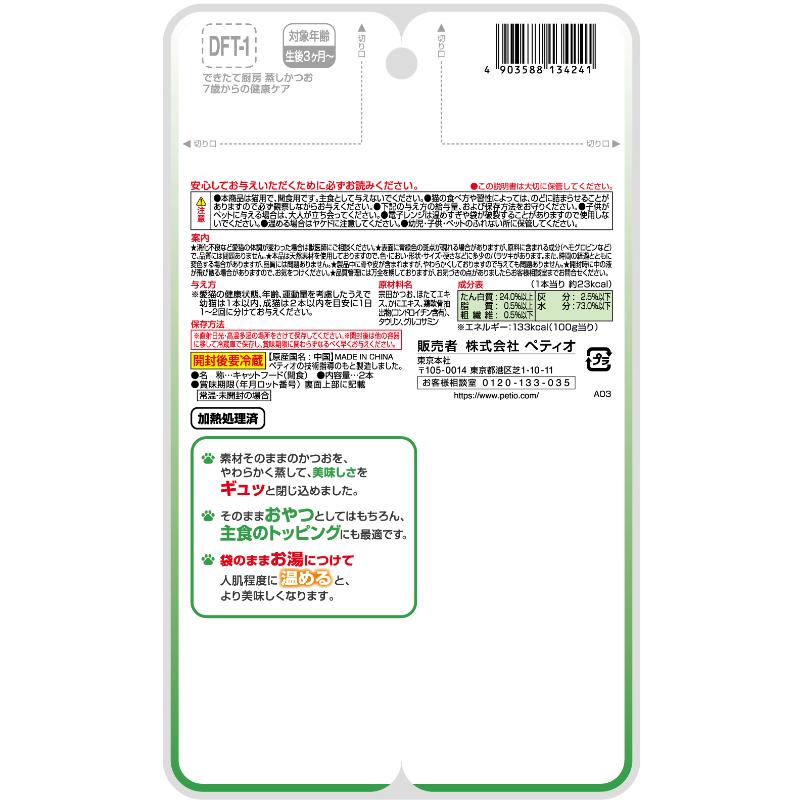 ・素材そのままの良質なかつおを、やわらかく蒸しました。・シニア猫の関節の健康維持にグルコサミン・コンドロイチン配合。・そのままおやつとしてはもちろん、主食のトッピングにも最適です。・袋のままお湯につけて人肌程度に温めると、より美味しくなります。・便利な2個分けパック。・ほたてとかにの旨味エキス入り、タウリン配合。・着色料、香料、酸化防止剤 不使用
