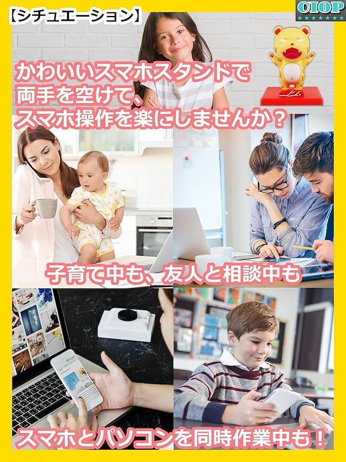 「サイズ」:奥行き8cmx横5.5cmx高さ7cm 「重さ」:約75g 「材質」:シリコン(生産国:中国) 「機能・用途」:スマホスタンド、スマホ立て