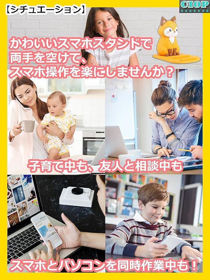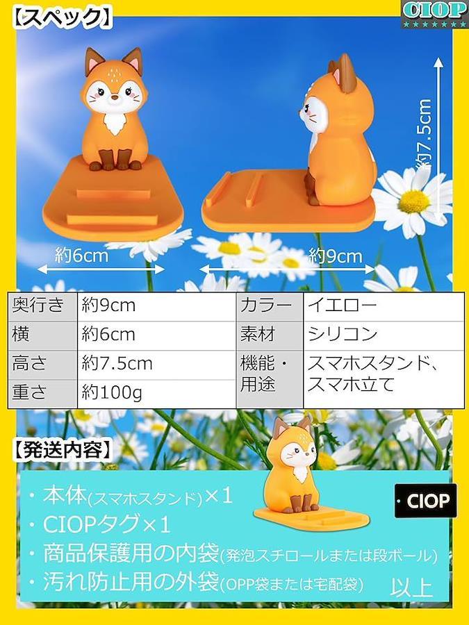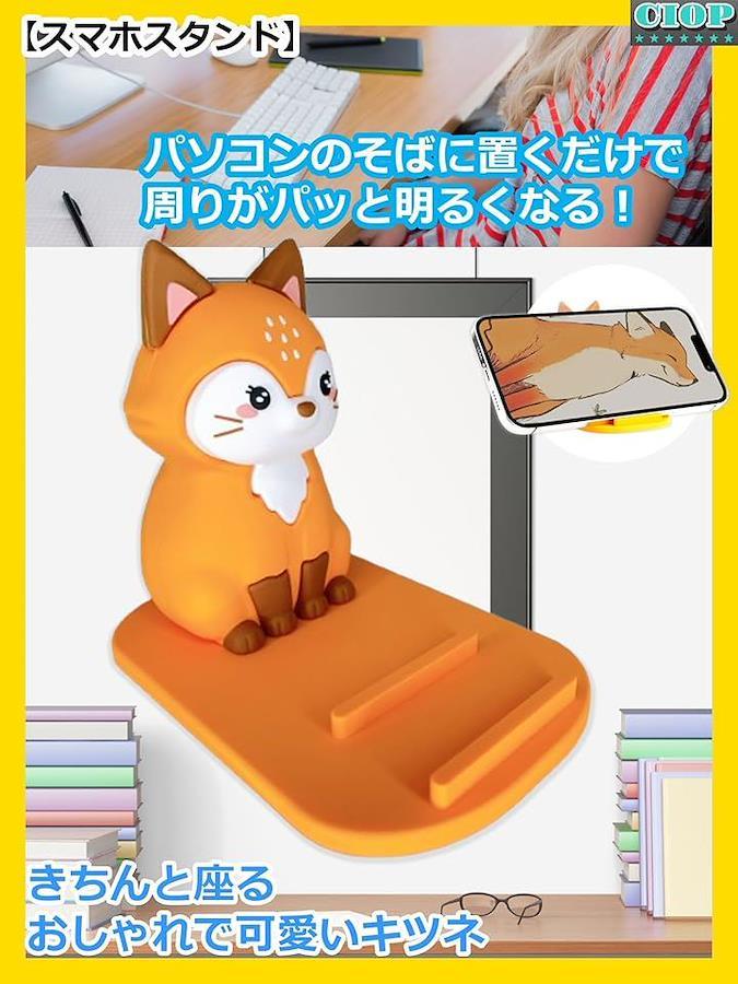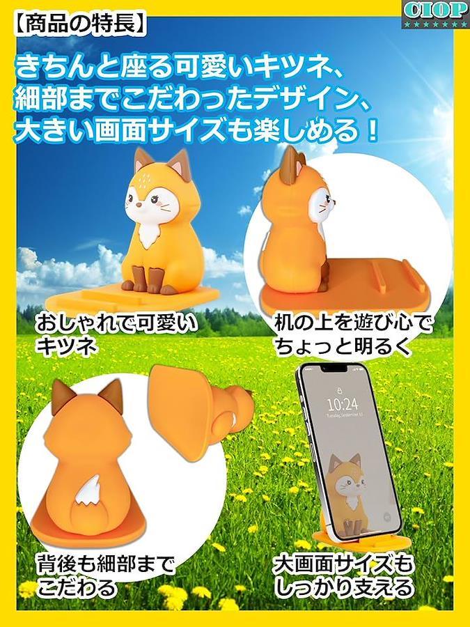「ユニークなデザイン」:優しくコミカルで かわいい きちんと座る キツネ があなたのスマホをやさしく支え見守ってくれます。