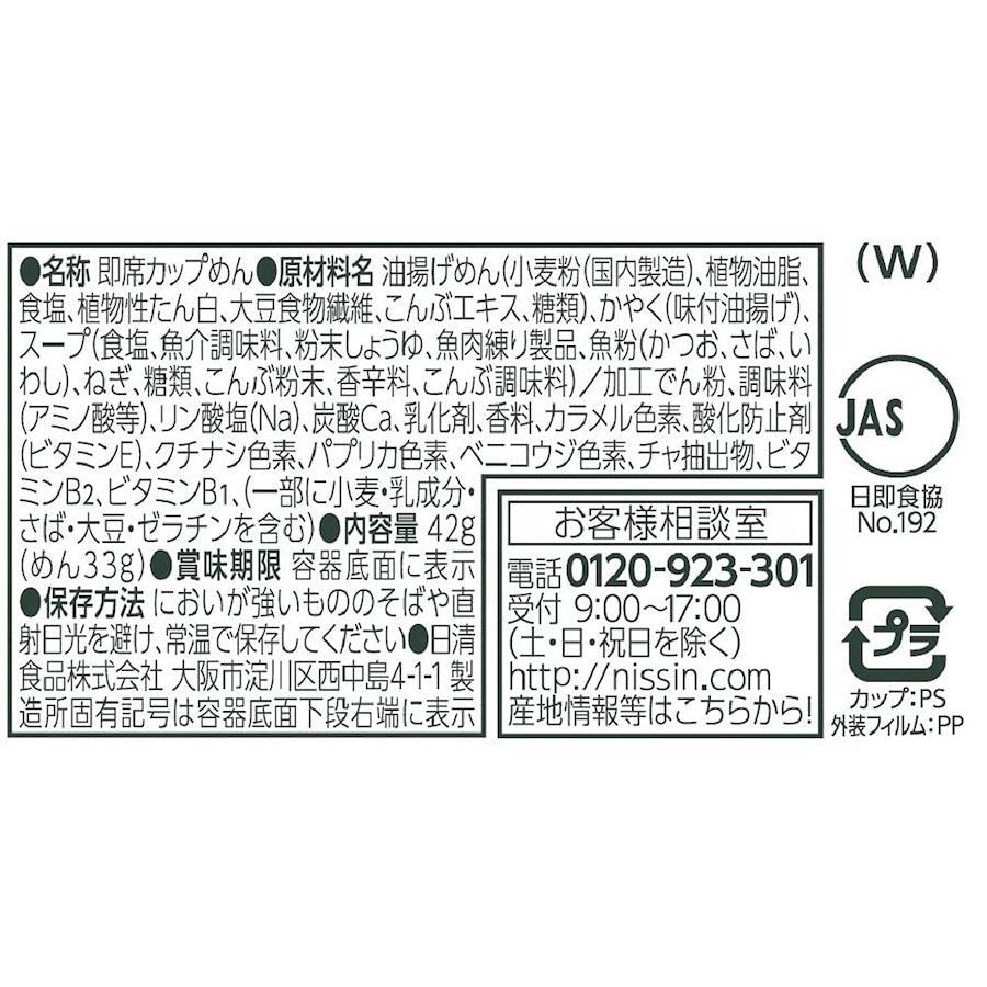 油揚げめん(小麦粉、植物油脂、食塩、植物性たん白、大豆食物繊維)、味付油揚げ、食塩、魚介エキス、醤油、魚肉練り製品、ねぎ、昆布エキス、糖類、香辛料、魚介調味油、加工でん粉、調味料(アミノ酸等)、リン酸塩(Na)、炭酸Ca、増粘多糖類、カラメル色素、乳化剤、香料、酸化防止剤(ビタミンE)、クチナシ色素、紅麹色素、ビタミンB2、ビタミンB1、(原材料の一部に乳成分、さば、ゼラチンを含む)