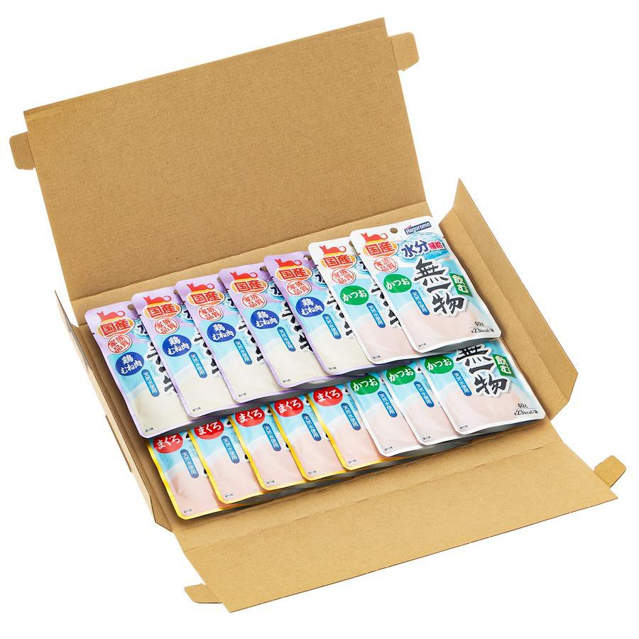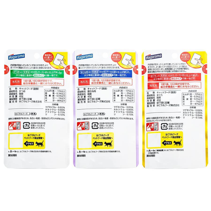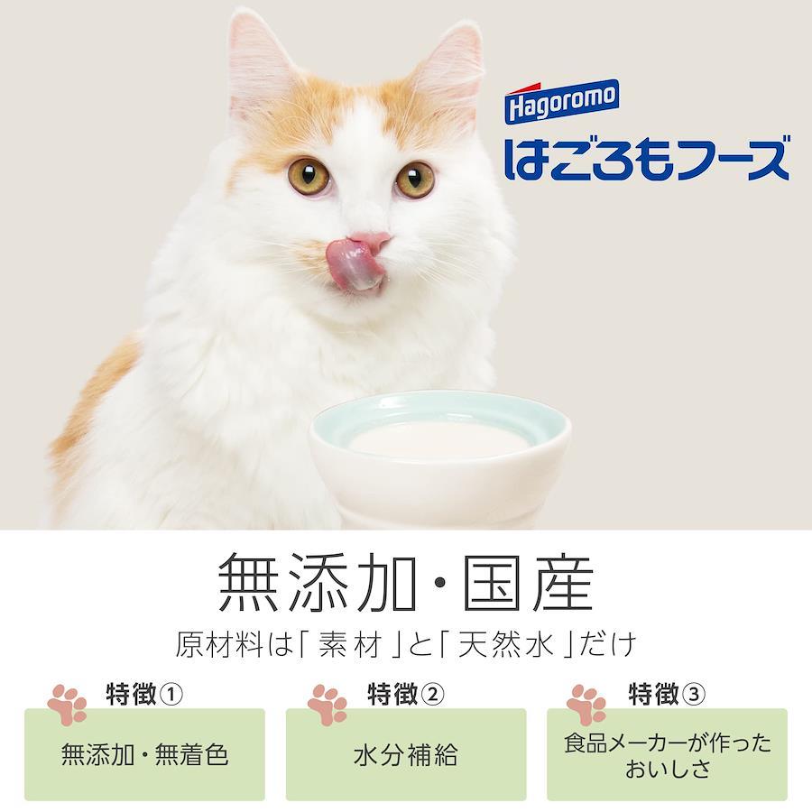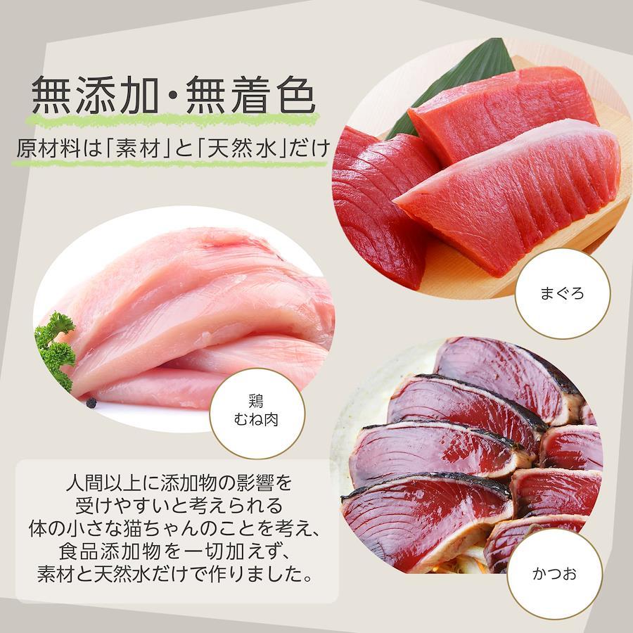 食品添加物を加えていない製品です。素材本来の旨みを味わいながら自然に水分補給ができるよう、素材と天然水だけで仕上げたキャットフードです。素材の【まぐろ】【かつお】【鶏むね肉】には良質なたんぱく質が豊富に含まれています。ペースト状になっていて与え方をアレンジできます。軽く振ってから開けるとペースト状に、よく振ってから開けると、さらさらの液状になります。毎日の食事はもちろん、夏の熱中症対策や冬の飲水量減少予防に最適です。【まぐろ】【かつお】【鶏むね肉】の3種が各5個ずつ入っています。